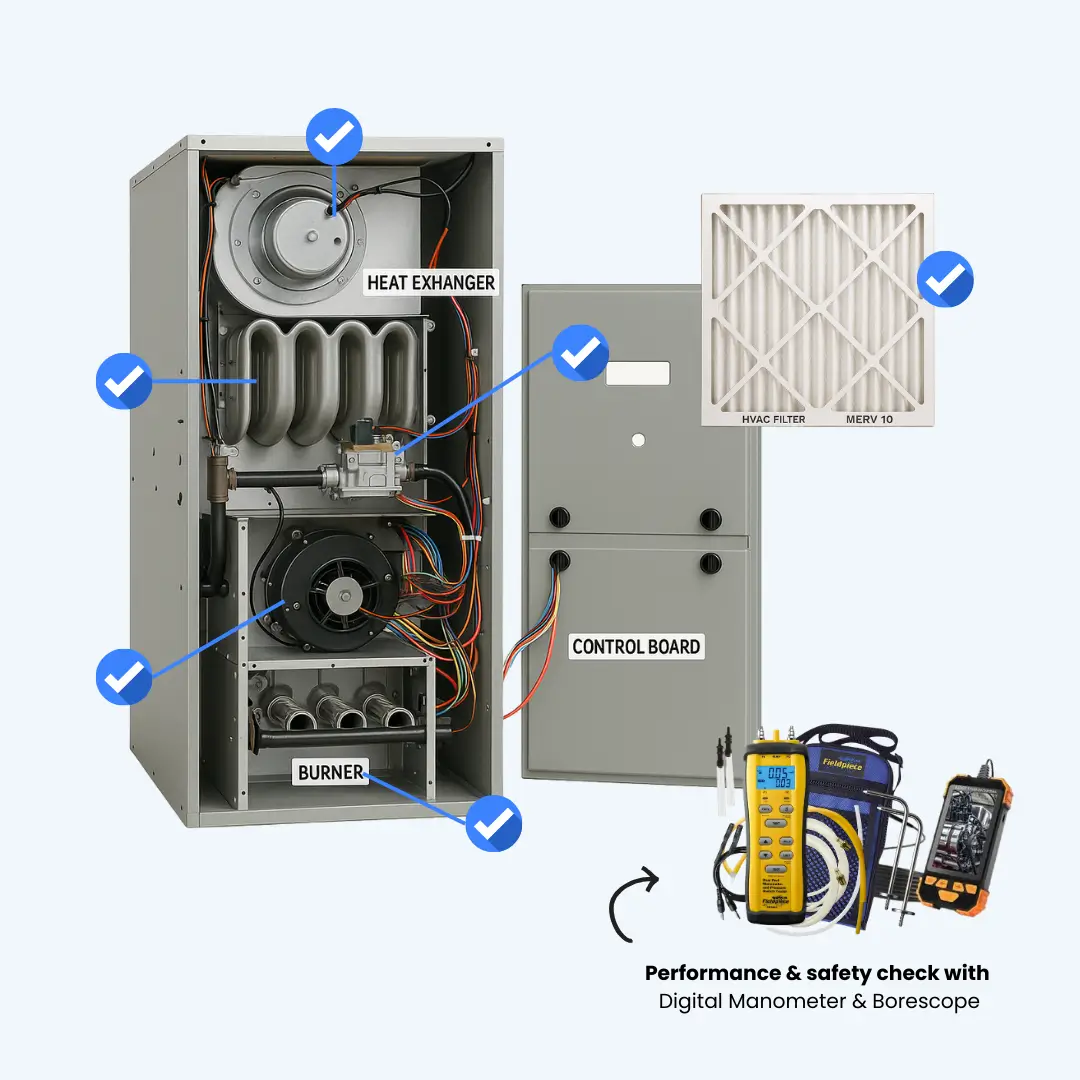 A simple tune-up can find small problems early before they turn into fire hazards, gas leaks, and "no-heat emergencies"